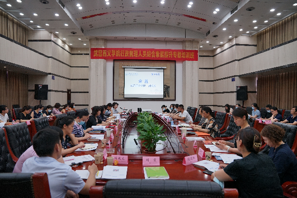 为提升行政人员管理服务水平,以良好的状态迎接本科教学合格评估,7月6日至10日,教师发展中心在行政楼8楼会议室组织开展了行政管理人员综合素能提升专题培训。党委副书记、副校长金鑫出席开班仪式并致辞,来自职能部门、图书馆、信息技术中心、各学院的科级以上管理人员共47人参加培训。
